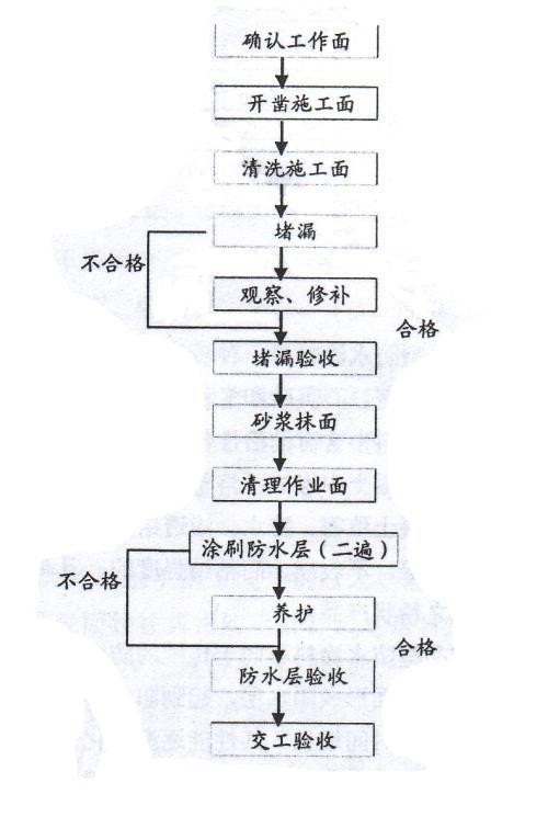 檢查墻地面是否有空鼓,開裂,脫落等問題,如果有進行維修填補。然后打掃干凈墻地面,調(diào)制好防水灰漿(按施工面積大小調(diào)制,調(diào)多浪費,調(diào)少),在墻地面進行涂刷,縱橫密集交錯涂刷,地漏,下水管口處做疊加層,施工完畢12-24小時后做閉水試驗,試驗24小時后檢查是否有滲漏,有滲漏進行補漏涂刷,無滲漏結束施工。
