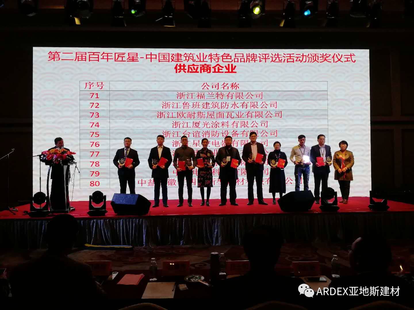 亞地斯建材(上海)有限公司憑借過硬的產(chǎn)品質(zhì)量,專業(yè)的服務(wù)理念和在業(yè)界良好的口碑,一舉獲得“中國(guó)建筑業(yè)特色品牌-優(yōu)質(zhì)材料設(shè)備供應(yīng)商”此項(xiàng)殊榮,由市場(chǎng)部總經(jīng)理代表公司上臺(tái)領(lǐng)獎(jiǎng)。