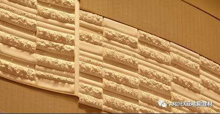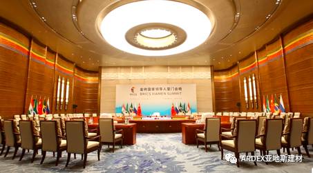 值得一提的是,五國大范圍會議室的主背景墻上6.75米高處,宋代名窯之一的德化瓷被做成了金磚五國國花的造型“貼”在了墻上。瓷磚膠正是采用了亞地斯(ARDEX)的輔材產品。