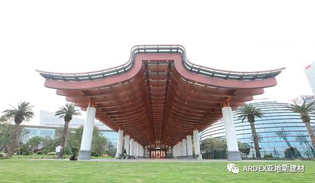 會議中心的東西兩側各有一條迎賓長廊,是整個會場的“門面”,也是各國領導人步入會場必經之地。長廊融入廈門市花鳳凰花和廈門傳統(tǒng)建筑山墻的造型,取名“丹冠飛羽”,由48樘“幾”字形銅梁組成,造型獨特、氣勢恢宏。